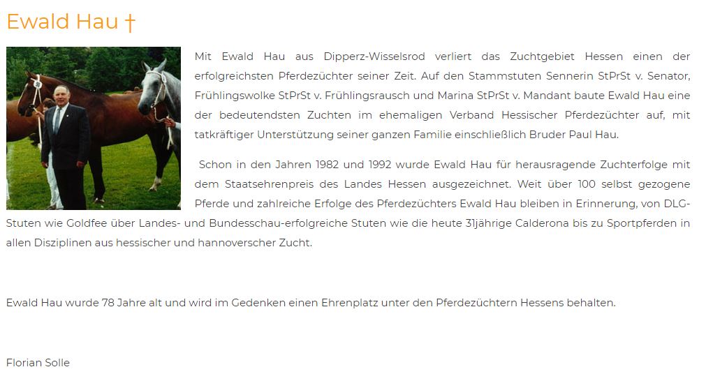 Seit 1970 führt Landwirtschaftsmeister Ewald Hau den Betrieb und so wurde der Zweig der Pferdezucht weiter ausgebaut, so dass der Hof einen festen Platz in der Hessischen Sportpferdezucht einnimmt.